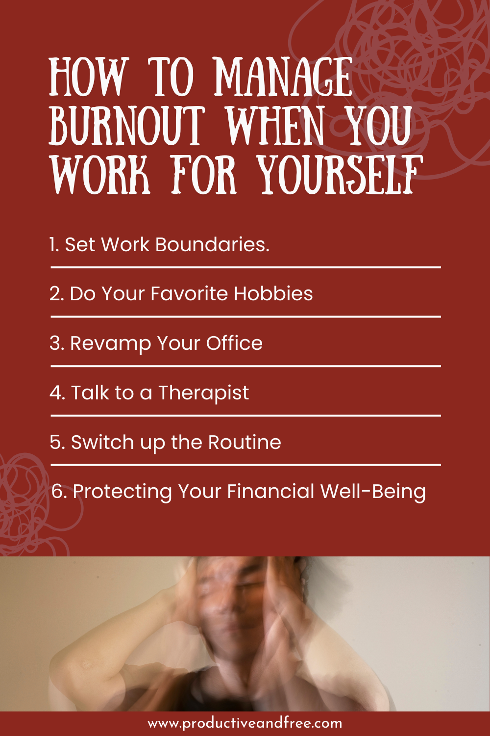 The first step in mitigating burnout is to set distinct boundaries between work and home. Many self-employed workers fall victim to working too many hours. The constant days of 10 to 12 hours or more can wear you down, so set a steady working schedule during the week that gives you the proper hours of a full-time job. There’s nothing wrong with a nine-to-five — even Dolly Parton says it’s a way to make a living.